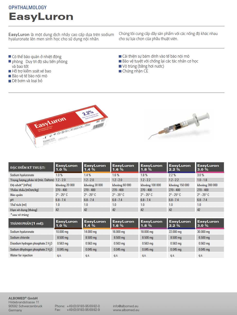 EasyLuron là một dung dịch nhầy cao cấp dựa trên sodium hyaluronate lên men sinh học cho sử dụng nội nhãn.